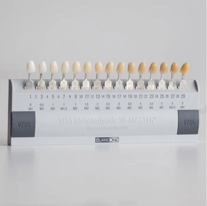 Шкала оттенков BlancOne® Vita 3D Master bleachedguide используется совместно с отбеливанием. Цвета расположены в порядке яркости в соответствии с системой цветокоррекции 3D Master. Цветовая шкала насчитывает 29 оттенков (0M1–5M3). Хранить в защищенном от света месте. Можно автоклавировать.