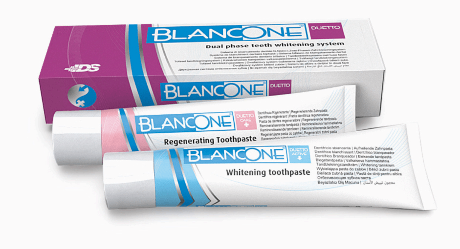 Комплект зубных паст отбеливающих BlancOne Duetto Двухфазная система отбеливания для домашнего использования. На основе двух разных агентов ACTIVE & CARE , которые можно использовать поочередно вместо обычной зубной пасты. Натуральные ферменты для растворения зубного налета и предотвращения образования биопленки Деликатные абразивы для удаления пятен без повреждения эмали Кристаллы пероксида для отбеливания пигментации эмали Оптический эффект для маскировки желтизны зубов BlancOne® DUETTO CARE Бикарбонат и каолин для придания блеска и яркости вашей улыбки Минеральный комплекс для укрепления и защиты эмали Фитотерапевтический комплекс для защиты слизистой от бактерий и окислительного процесса Омега-3 и витамины для питания и восстановления десен BlancOne® DUETTO ACTIVE